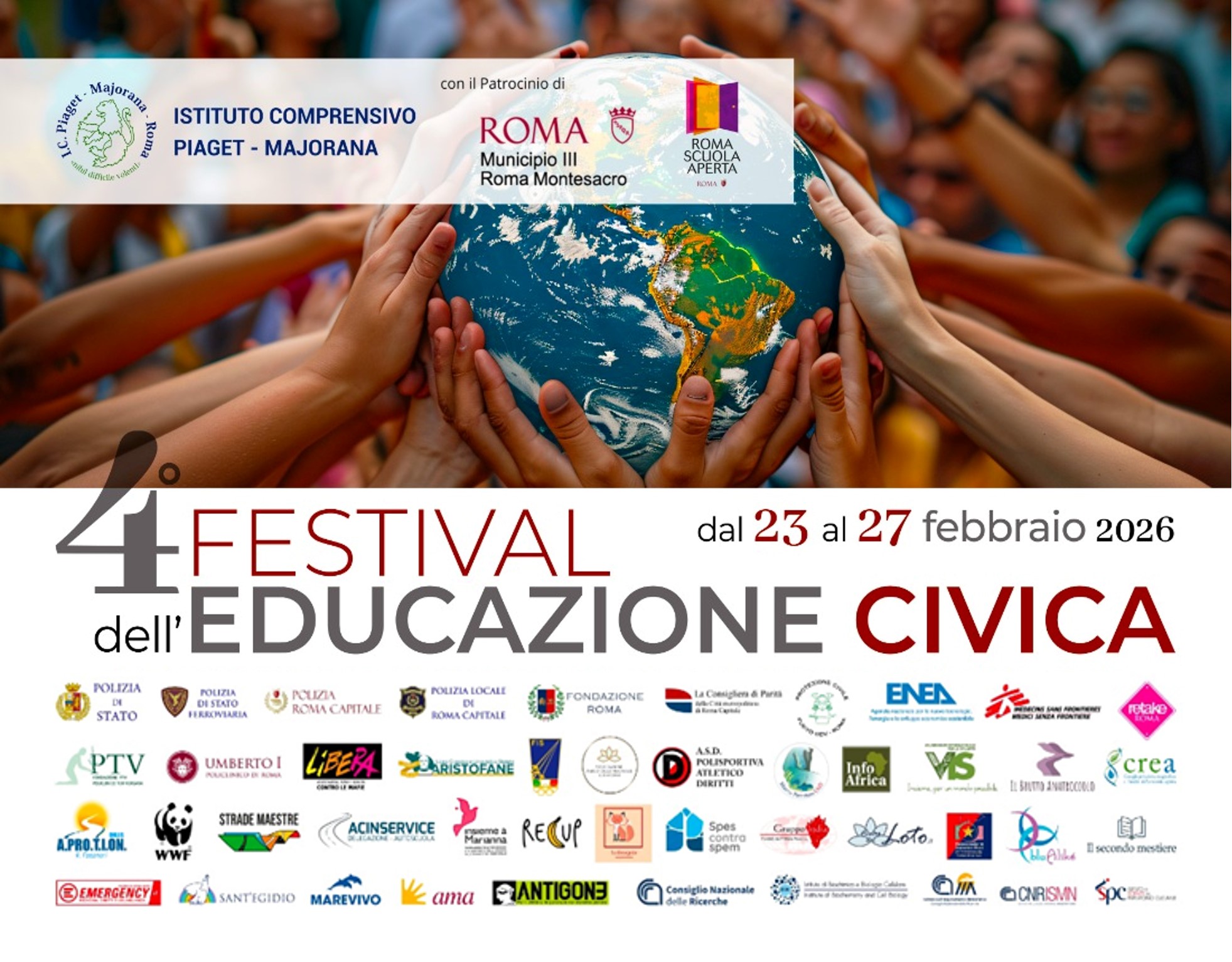 Dal 23 al 27 febbraio 2026 si è svolta la 4a edizione del Festival dell’Educazione Civica presso l’Istituto Comprensivo Piaget-Majorana di Roma. Il Festival rappresenta un pilastro dell’offerta formativa dell’Istituto, con l’obiettivo di offrire agli studenti modelli positivi e spunti di riflessione che possano arricchire il loro percorso di crescita come cittadini consapevoli.